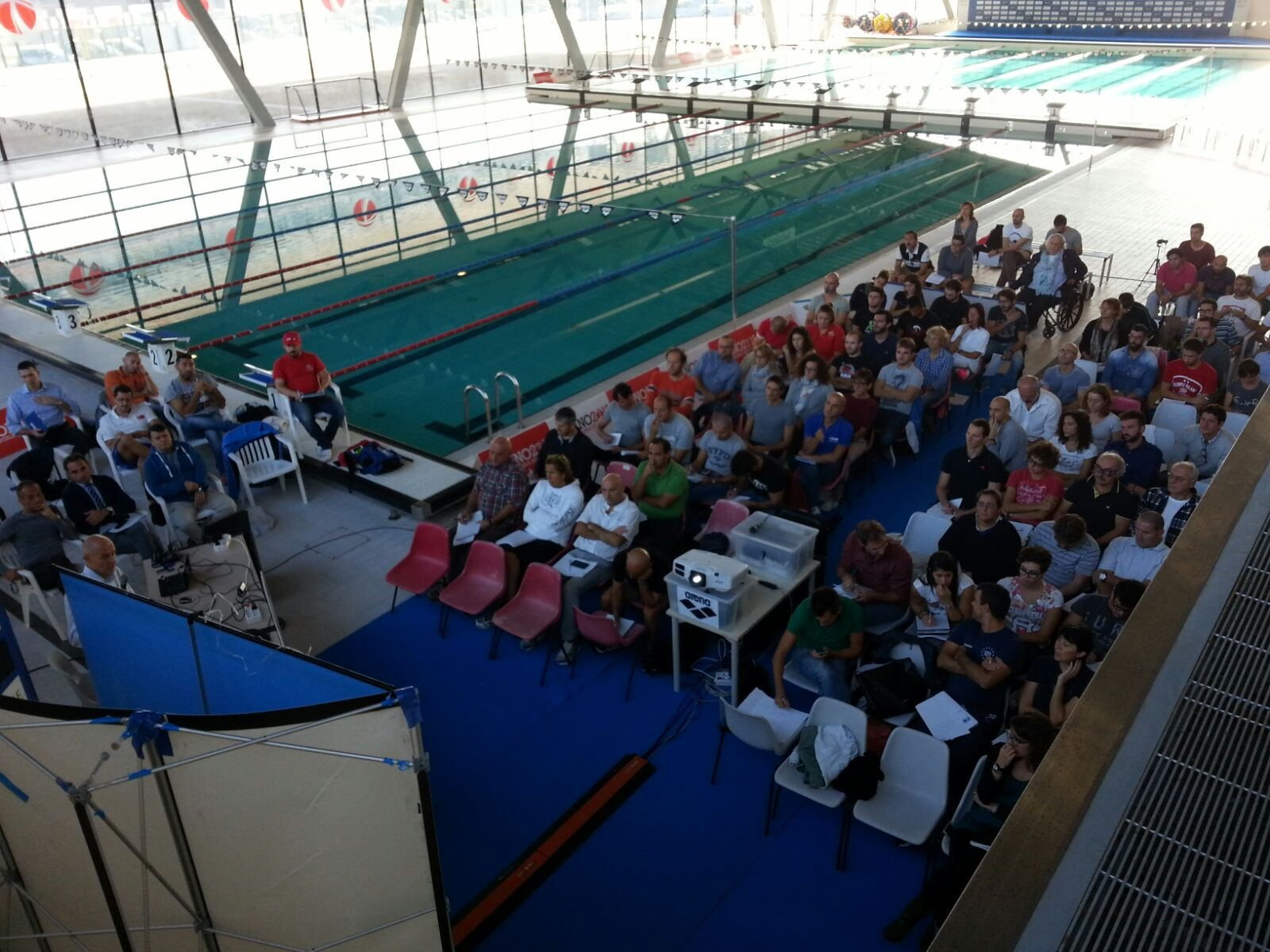 Un bel momento di formazione che si è svolto al Palazzo del Nuoto di Torino e che ha potuto contare su un 'parterre de rois' di relatori composto dal Prof. Marco Lancissi, preparatore atletico nazionale assoluta di nuoto, dal Prof. Ivo Ferretti, responsabile area biomeccanica della Fin, e dal Dott. Mirko Mazzoli, psicologo dello sport. Insieme a loro anche la Dott.ssa Giorgia Biano, dietista, e Dott.ssa Letizia Navarino, psicologa dello sport, che hanno presentato il progetto "Enjoy to Swim". Alla giornata erano presenti 87 tra allentaori e istruttori, di cui 12 provenienti dalla Lombardia, 2 dalla Puglia, 1 dalla Sicilia e 1 dal veneto.