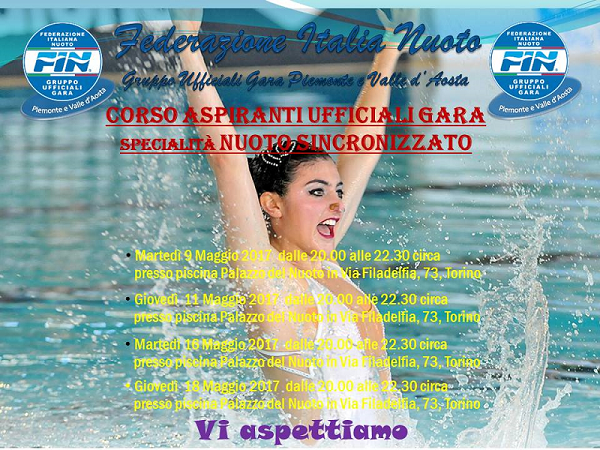 Il Gruppo Ufficiali Gara del Comitato Regionale FIN Piemonte e Valle d'Aosta organizza un corso per aspiranti Ufficiali Gara di nuoto sincronizzato. Il corso è strutturato su quattro incontri in programma al Palazzo del Nuoto di Torino, in via Filadelfia 73. Il primo incontro si terrà martedì 9 maggio dalle 20 alle 22.30 circa; i successivi tre, con analogo orario, saranno giovedì 11, martedì 16 e giovedì 18 maggio. Il corso è gratuito salvo la somma di 15 euro da versare per l'assicurazione e per il tesseramento al Gruppo Ufficiali Gara. Tutti gli interessati sono pregati di prenotarsi all'inidirizzo e-mail gugpiemonte@gmail.com