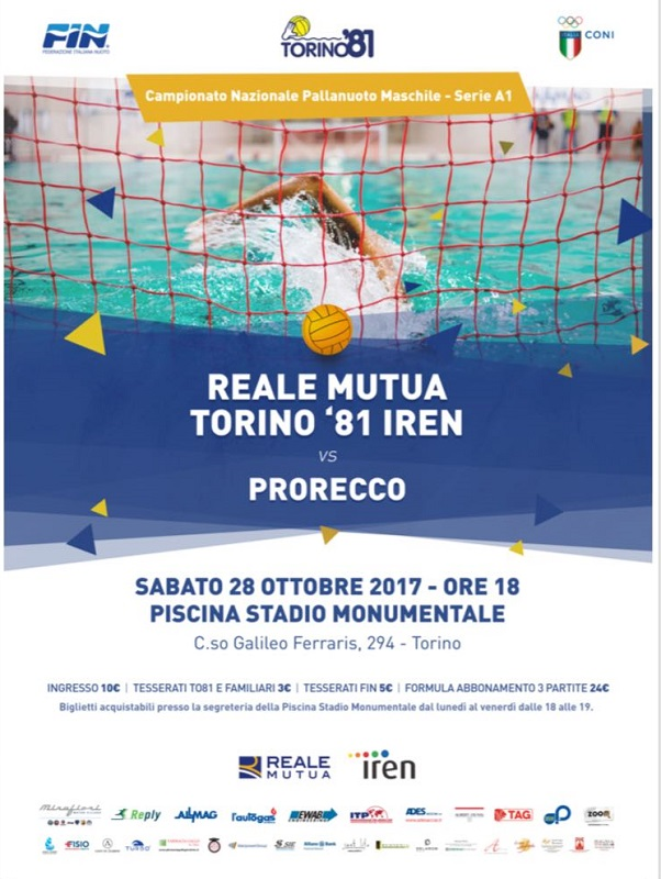Archiviata la sconfitta nel difficile esordio sul campo dello Sport Management, la Reale Mutua Torino 81 Iren è pronta a rituffarsi in acqua per la seconda giornata del campionato di A1, la prima in casa. Sabato alla piscina Monumentale di Torino la squadra guidata da coach Simone Aversa affronterà i campionissimi della Pro Recco, vincitori degli ultimi 12 scudetti, l'ultimo dei quali conquistato nella Final Six disputata a maggio al Palazzo del Nuoto di Torino. Il match inizierà alle 18 e avrà un biglietto d'ingresso, con i prezzi indicati di seguito:
