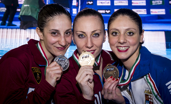 Tre giorni di “tutto esaurito”, di spettacolo e prestazioni notevoli dal punto di vista tecnico hanno caratterizzato il Campionato Assoluto Invernale di nuoto sincronizzato, accolto per il secondo anno consecutivo dallo Stadio del Nuoto di Cuneo. La manifestazione si è aperta venerdì con le eliminatorie delle specialità solo, duo e squadra, che hanno promosso alla finale le prime 14 classificate. Nella seconda giornata – ieri – sono state assegnate le prime medaglie. Negli obbligatori, che hanno visto protagoniste 189 atlete, queste sono andate al collo di Manila Flamini (Fiamme Oro/Aurelia Unicusano), prima con con 79,833 punti, di Francesca Deidda (Fiamme Oro), seconda con 79,394, e Linda Cerruti (Marina Militare/RN Savona), terza con 78,363. Il sabato di gare è proseguito con la finale del duo, vinta dall'attesissima coppia Linda Cerruti-Costanza Ferro (Marina Militare/RN Savona), sesta alle Olimpiadi di Rio. Con 93,367 le due liguri classe 1993 hanno preceduto il duo misto Manila Flamini-Giorgio Minisini (Fiamme Oro/Aurelia Unicusano), secondo con 91,300 punti, e la coppia Elisa Bozzo-Gemma Galli (Marina Militare/Aurelia Unicusano), bronzo con 87,700.